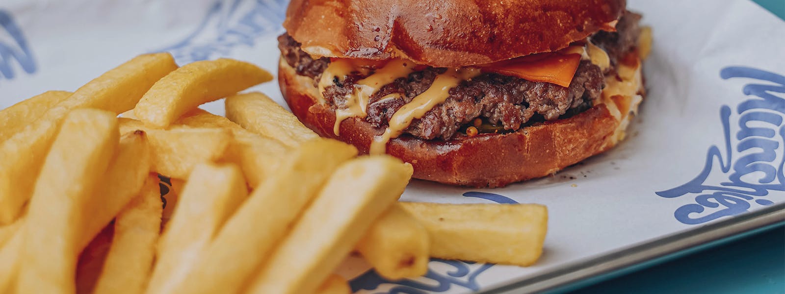 Podwójny Cheeseburger w zestawiemaślana bułka, 2x wołowina, ogórek piklowany, 2x cheddar, czerwona cebula i sos chilli-mayo.